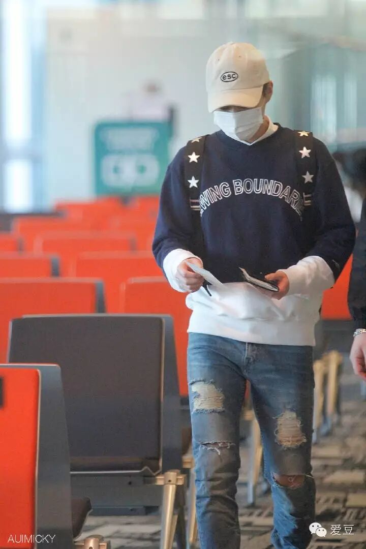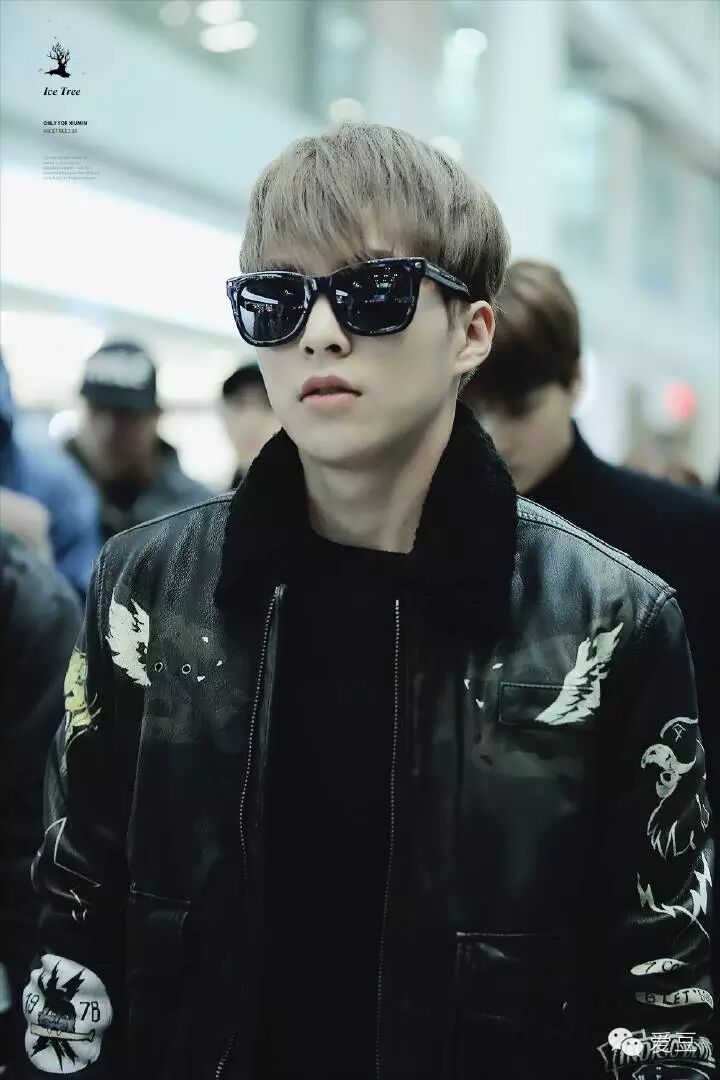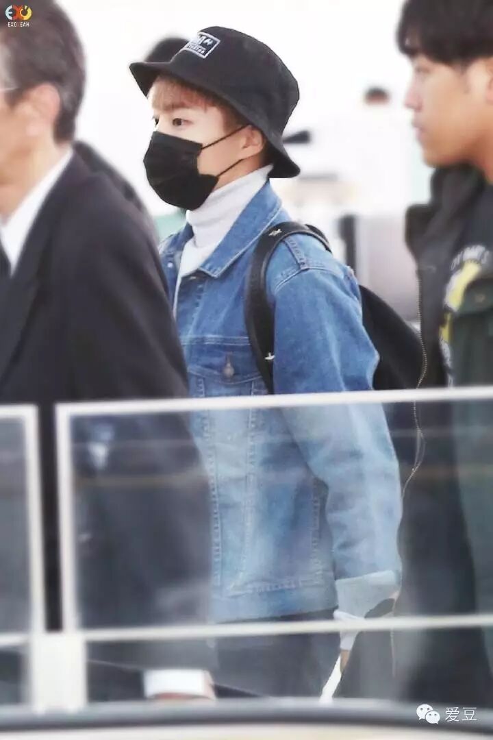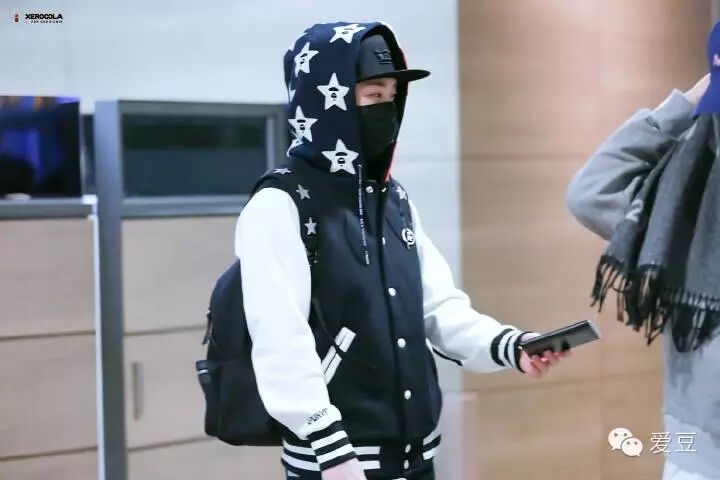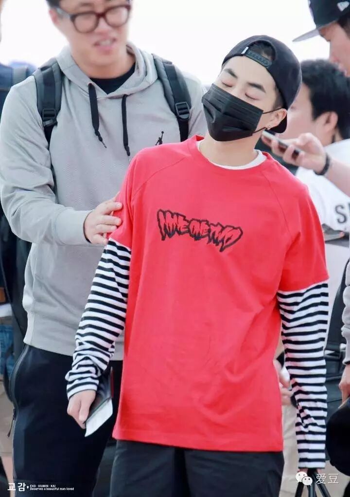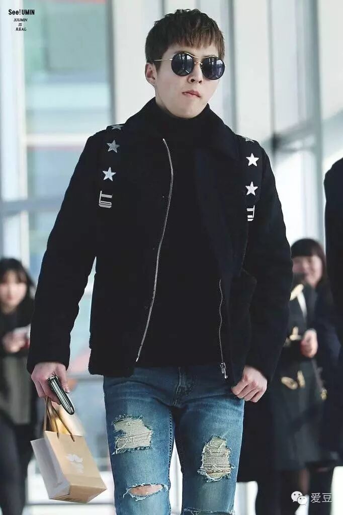 拼接撞色还有夸张印花的T恤还有连帽卫衣棒球服,xiumin用深色紧身下装或者破洞牛仔裤进行混搭,完美消化街头风的机场look~