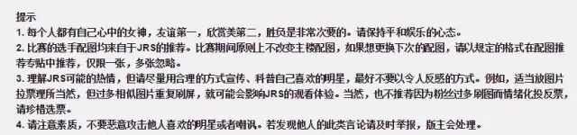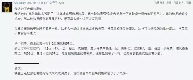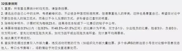 对于直男们组团推荐的女艺人,主办者给予她们参赛资格,并接纳网友的建议,把预选赛中的1对1比拼改为双败赛制。