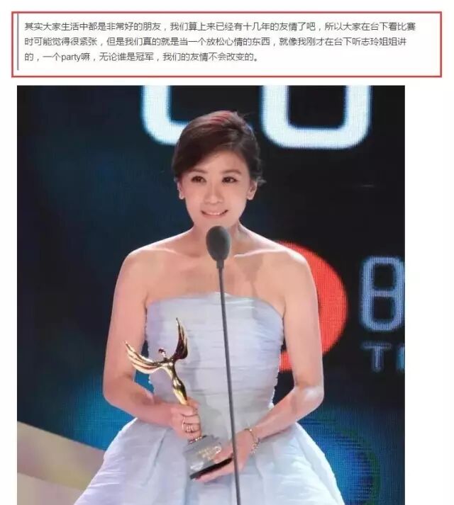 一会儿又模拟获奖感言。在去年总决赛后,贴出冠军贾静雯手捧奖杯的照片,并以女神口吻配文 “无论谁是冠军,我们的友情都不会变。”