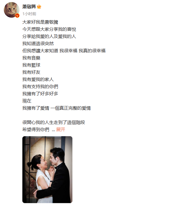 萧敬腾发布微博称自己拥有了一个真正完整的爱情,也很开心自己的人生走到了这个阶段,希望可以得到大家的祝福,也祝福大家可以找到真正属于自己的幸福。