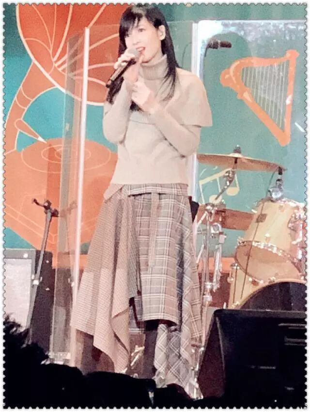 站在c位的周慧敏真是全场的焦点呀,涂着粉嫩的口红周慧敏整个人看起来很粉嫩,灰色的毛衣搭配格子的半身裙,很文艺,浅灰色和灰色的格子凭借,很有时尚感,充满了英伦风,有点百褶的裙摆,很有层次感呢。