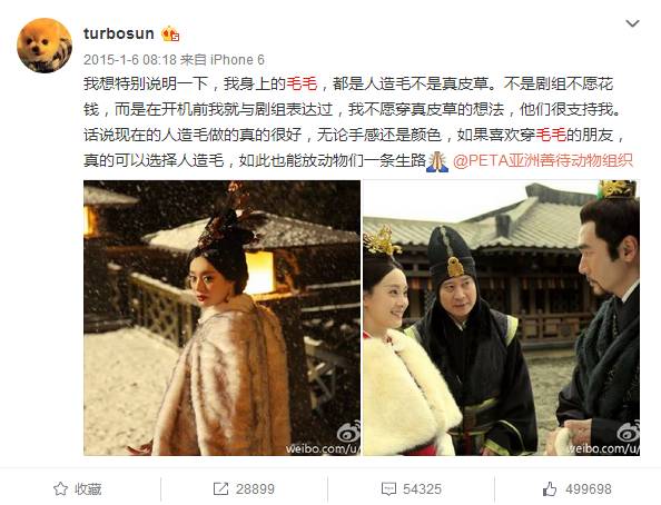 孙俪赶紧发微博澄清,自己所穿的是特地要求剧组制作的人造毛,并@了PETA亚洲善待动物组织