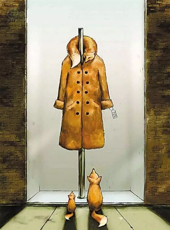 从前有幸福的狐狸一家,一天,贪心的人类,把妈妈抓走了。失去亲人的爸爸和宝宝很伤心,他们决定把妈妈找回来。经过了很长时间,走过了很多地方,却始终没有妈妈的影子,终于有一天在某个城市一家商店的橱窗前,看到了狐狸妈妈。她正“躺”在一件狐皮大衣的领子上,仿佛睡着了。狐狸爸爸和狐狸宝宝欣喜万分,呼唤亲人快快醒来,一起回家。却不知道妈妈永远都不会醒来。于是他们静静等在橱窗前,直到死去……