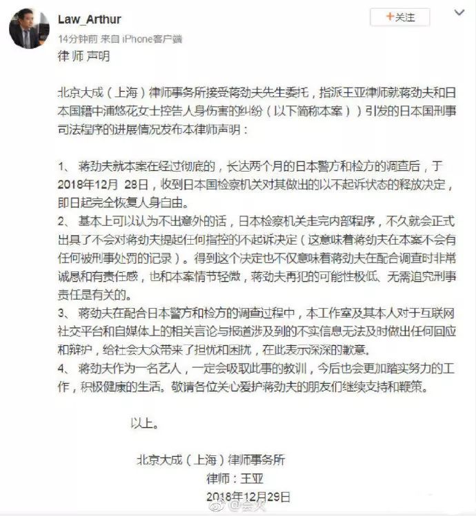 随后,蒋劲夫的律师发表声明证明此事,表示在28日收到日本检察机关做出的以不起诉状态的释放决定,即日起完全恢复人身自由。不出意外的话,日本检方不久将正式出具不会对蒋劲夫提起任何指控的不起诉决定。