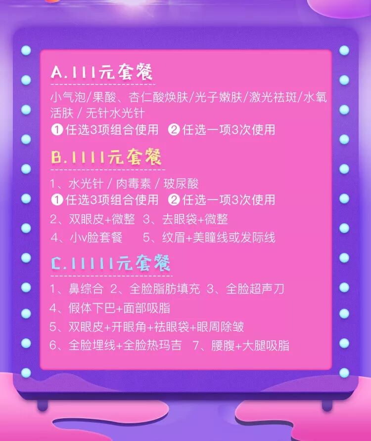 还有超级优惠,让你变美不用吃土的双十一低价套餐,区花已经把瘦脸针和水光针通通预约起来啦!