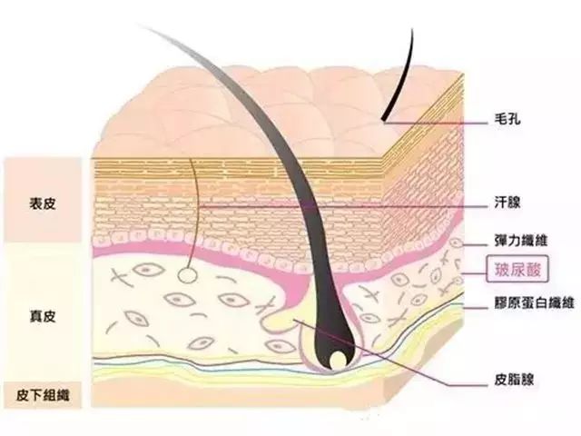 很多人不懂玻尿酸不是用来塑形的吗,为什么可以打到皮肤里保湿,首先水光针注射的玻尿酸是小分子的,区别于塑形用的大分子和中分子,而且是不交联的。其次玻尿酸本身就以胶状的形态存在于我们的真皮组织中,如图。