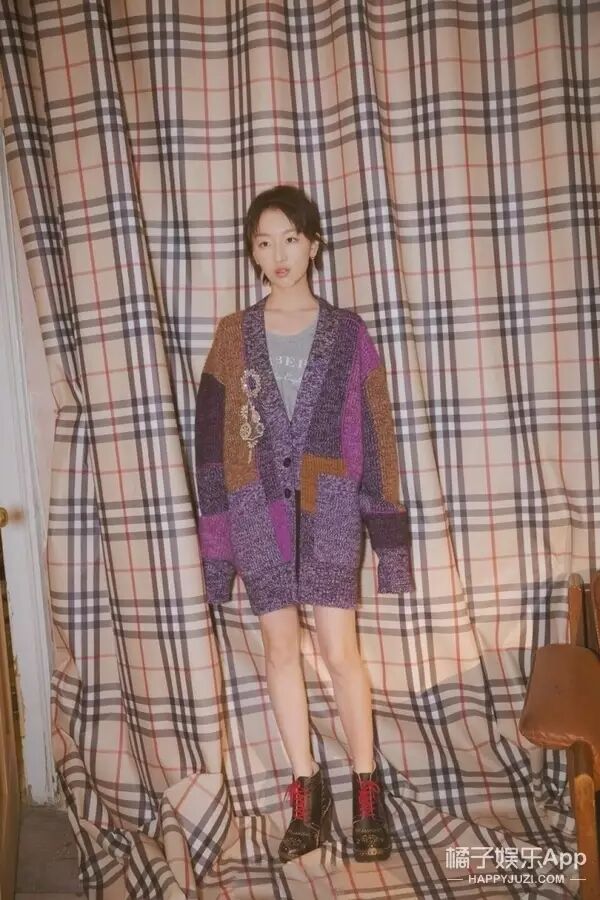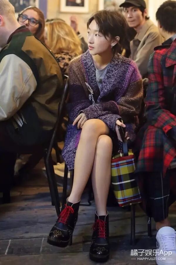把针织衫当裙子穿内搭灰T的瘦小周冬雨,也别有一番韵味!搭配同季度的铆钉皮革木跟靴,英伦风精致又出彩。