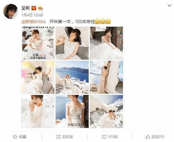 在1月4日的时候,吴昕在自己的微博上晒出了一组美美的婚纱照。这是一组写真集,和结婚并没有什么关系。