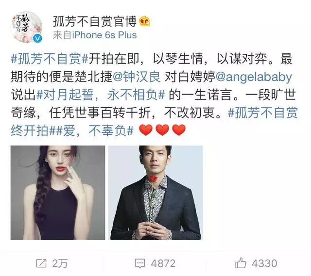 电视剧《孤芳不自赏》终于公布了男女主演阵容,钟汉良饰男主楚北捷,杨颖饰女主白娉婷,如此养眼组合粉丝大呼必须“约约约”!