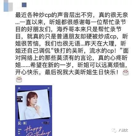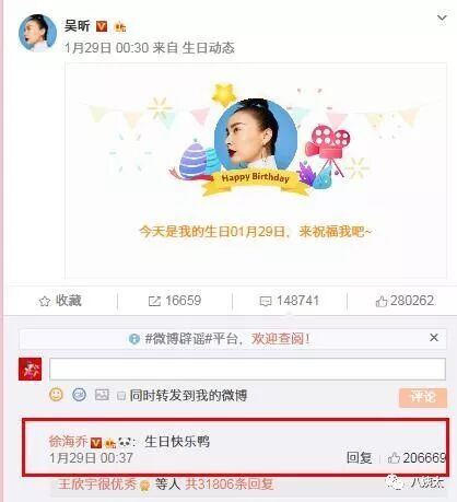 两人CP正热时迎来了吴昕的生日,微博系统在零点30分的时候推送了吴昕的生日消息,7分钟后徐海乔留言祝福吴昕生日快乐。
