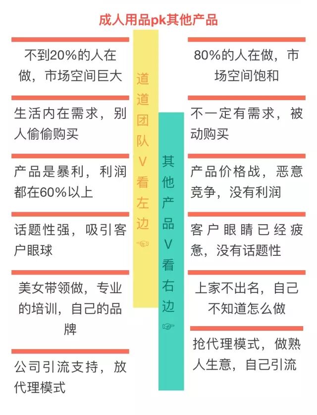 情趣用品是微商的一个新生儿,因为有的人还没有意识到,有的人看不起做,有的人还沉浸在过去的面膜化妆品护肤品时代。所以,魏道道在遇到情趣用品的时候眼前一亮,想到趁别人还没有觉醒和看懂这个巨大商机的时候抢先一步抢占市场。而这两年别的微商红利期已过,成人用品属于私密性产品,避免尴尬,回购率也高,而且年轻人都感兴趣,又是人人所需。