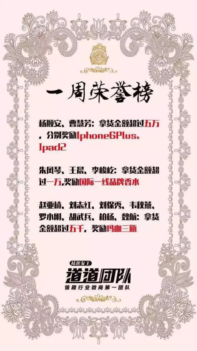 在利润上也是爆利,比起卖面膜、服装,这将是一片处女地,一个全新的,超大空间的市场在微信悄悄的崛起。在前进路上一向敏感的魏道道看来,“情趣创业”的出现意味着微商新时代的来临,微商真正的机遇来临了。她经常跟别人聊天说到,如果你错过了两年前的面膜化妆品微商的机会,那么一定不要在错过选择情趣用品微商的机会。