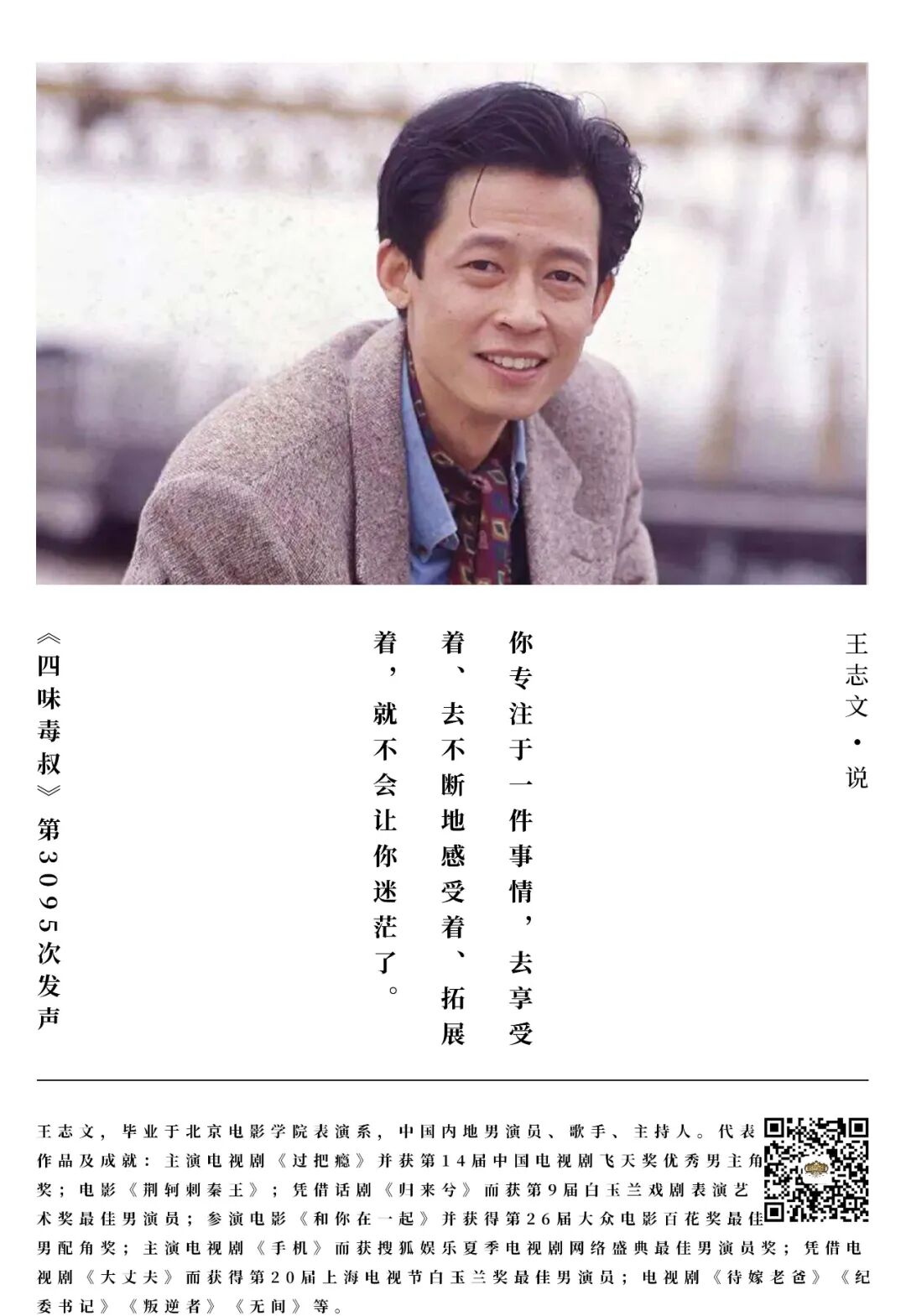 王志文:多好的问题。其实这三十多年,将近四十年的时间,鄙人一直在做着一件事情,就是为了刚才你提到的这个问题,我觉得可以让遗憾变得少一些。你专注于一件事情,去享受着、去不断地感受着、拓展着,就不会让你迷茫了。