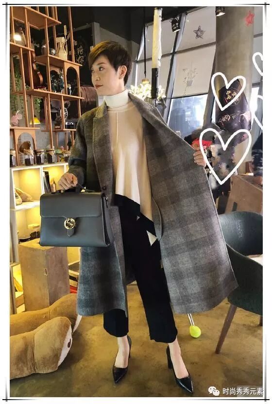 米白色的高领毛衣简约独特,不规则的衣摆更加的大气一些,搭配黑色的九分长裤精干加分,配上黑色的包尖高跟鞋时尚不已,灰色的格子大衣瞬间气场满分。
