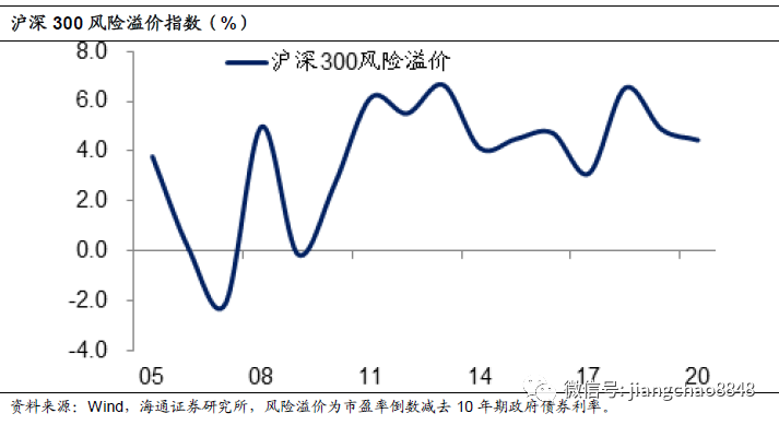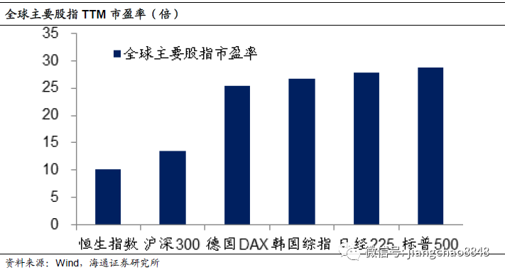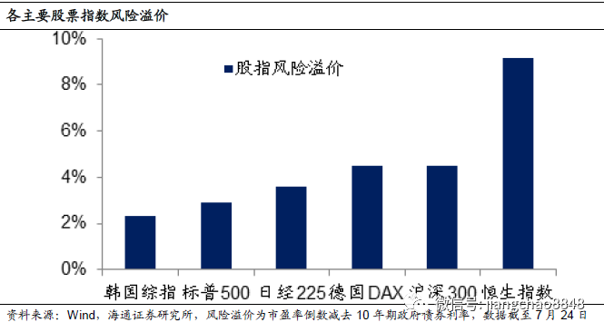 为了消除利率水平对估值的影响,我们计算了主要股票指数的风险溢价,发现港股是最有价值的,其恒生指数的风险溢价高达9.1%,而沪深300指数的风险溢价为4.4%,与德国DAX相当,但高于日经225指数的3.6%,以及标普400指数的2.9%,说明剔除利率影响之后A股的估值也是有相对优势的。