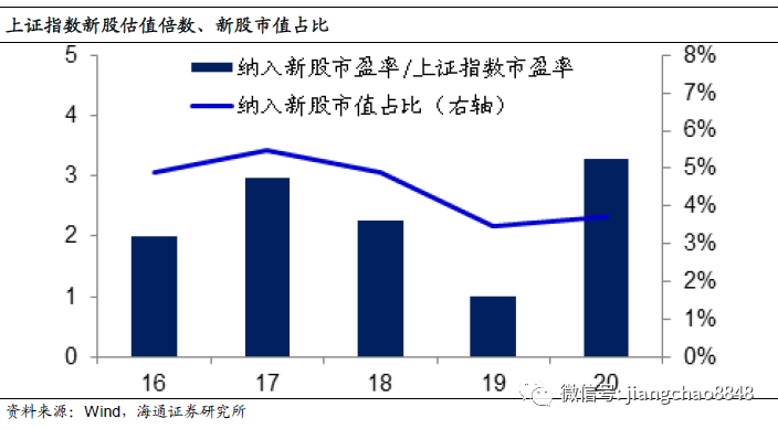 而在中国股市,新股总是比现有的股票贵很多。我们在报告《牛市结束了吗——为何经济复苏而股市下跌?》中曾提到,过去3年上证新股计入指数当日市盈率均值是上证指数的3倍以上。在本文中,我们把上证指数每年的新股市值加总,再除以新股的总盈利,得到当年新股的平均市盈率,并与上证指数的市盈率进行比较。结果我们发现,除了在大量发行银行股的2019年,其余4年新股计入指数时的平均市盈率为指数市盈率的2.5倍以上。