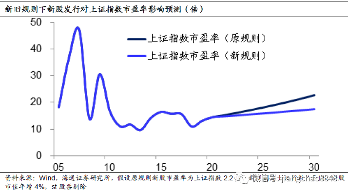 假设未来上证指数的新股市值依然是以4%的速度增加,但是区别在于其计入指数的相对市盈率倍数从2.2倍降至1.5倍,那么10年之后上证指数的市盈率会从14.5倍升至17.5倍,依然低于18.5倍的历史均值,远低于原规则下的预期22.7倍市盈率,相对而言更有投资价值。