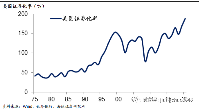 在发达国家中,目前美国的证券化率高高在上,已经达到189%,接近巴菲特所警示的区间。但美元是全球储备货币,美股可以得到全球资本的投资,而且还有美联储开动印钞机的支持,而A股和港股投资的主要资金来自于中国大陆,加上我们的央行相对更加稳健,这意味着美国当前高企的证券化率对我们未来的参考意义不大。