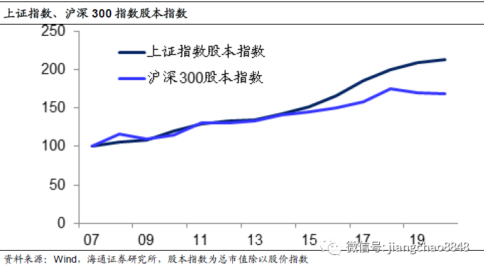 但是问题在于,2010年的A股估值就不贵了,当年上证指数和沪深300指数的TTM市盈率分别为16.7和15.3倍,为何大家印象中过去10年股市的回报依然不佳?在中国股市,有一个重要的问题其实在于大量的新股供给。如果用股指的市值除以股票指数的点位,可以得到股指对应的股本指数。我们发现,从07年至今,上证指数的股本翻了一倍多,而沪深300指数的股本也增长了70%。