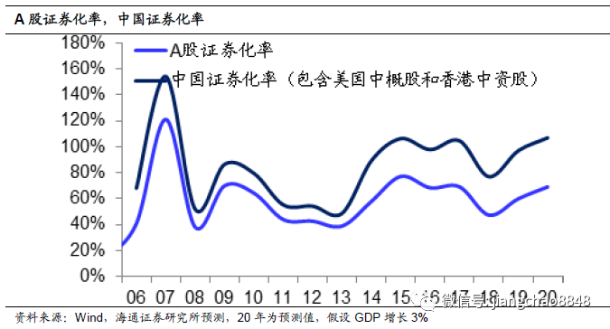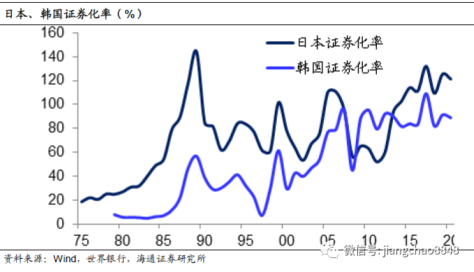 同在东亚地区的日本和韩国,其最新的证券化率分别为121%和89%,而且均处于历史最高位附近。而从经济发展的程度来看,如果我国证券化率大幅超过日韩的水平,其实是需要引起警惕的。