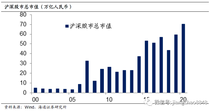 但是如果大家换一个视角,从市值的角度来看A股,结论其实完全不一样。从00年到2019年,虽然上证指数变化不大,但是A股的总市值已经从不到5万亿升至59万亿,增幅超过10倍,并不逊色于同期的经济表现。也就是说,A股的主要问题是二级市场不赚钱,但在一级市场发行股票其实是大获丰收。