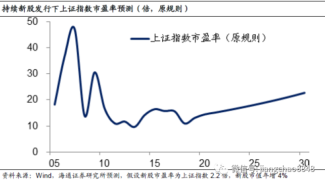 而如果源源不断发行新股,并且以远高于市场的估值水平计入上证指数,那么指数就会越来越贵。我们假设上证指数的新股市值年均增长4%,并且按照原有规则在第11个交易日计入指数,且新股的市盈率为现有指数水平的2.2倍,那么在10年以后上证指数的市盈率会从当前的14.5倍升至22.7倍,远超18.5倍的历史均值,根本说不上便宜。