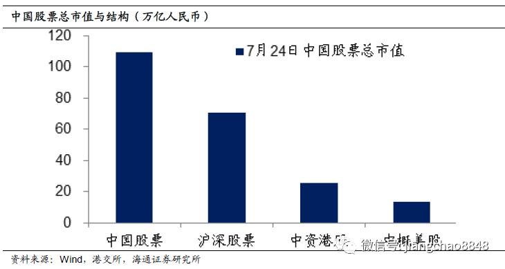 截止7月24日,A股总市值为70.4万亿,但这还不是中国股票的总市值。根据港交所的数据,去年中国香港股市市值的73%为中资企业,目前中国香港股市总市值为38万亿港币,对应中资港股市值为28万亿港币,折合25.4万亿人民币。此外,在美国市场交易的中概股最新市值为1.87万亿美元,折合13万亿人民币。因此将各地股票市值加总之后,其实中国股票的总市值已经达到了109万亿人民币。