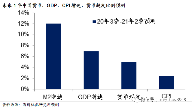 展望未来1年,我们认为在疫情得到有效控制之后,加上积极货币财政政策的生效,经济有望逐季复苏,加上疫情导致的低基数效应,预测从20年3季度到21年2季度的1年内GDP增速有望达到7%,同时货币增速有望继续小幅回升至12%,对应货币超发程度为5%,CPI大约为2.4%,这其实与过去8年的平均水平大致相当。
