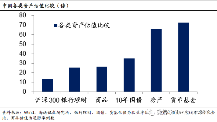 而且我们发现,如果直接比较国内主要资产的估值水平,以沪深300指数为代表的A股也是相对最便宜的。目前3个月银行理财收益率为3.9%,对应估值水平为25.6倍,也就是需要25.6年其收益才能回本。我们以CPI通胀来代表商品的回报率,今年上半年CPI为3.8%,对应商品的估值水平为26.3倍。中国10年期国债利率最新为2.86%,对应估值为35倍。而一线城市的租金回报率为1.51%,对应估值水平为66倍。估值最贵的是货币基金,目前余额宝的7天年化收益率仅为1.38%,对应估值高达72.5倍。