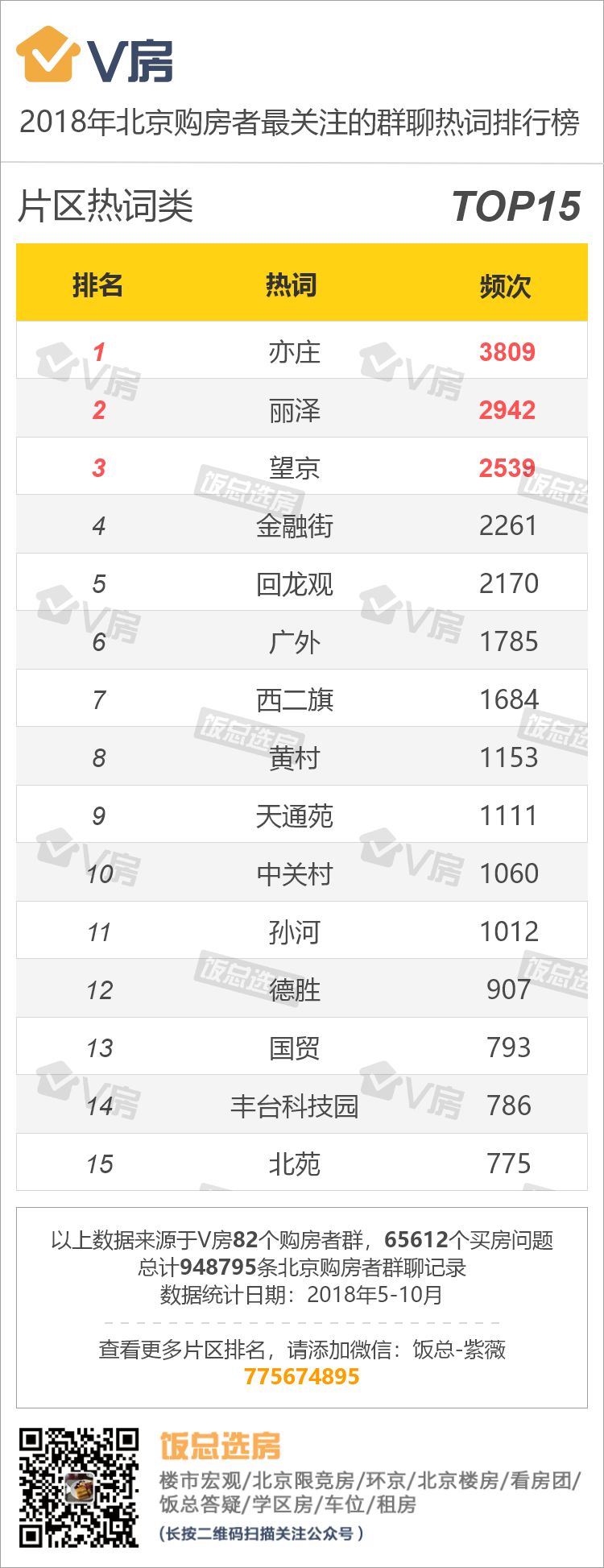 我们整理了覆盖房产领域数万个热词的标签库,其中涉及到北京的片区标签有几百个。程序猿可爱的小手编程了相似度比对算法,将标签与今年5月到10月,82个购房群,948795条北京购房者的群聊记录(去除语音和表情)数据进行相似度分析,得出了2018北京购房者最关注的片区热词榜,截取了TOP15供大家了解。