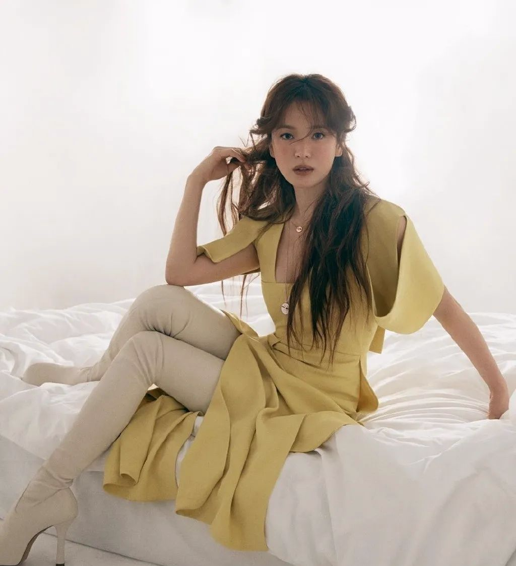 好吧,反正,这个又属于什么妆容,还不得而知,总之就像个喝醉酒的姑娘,似有似无的脸颊有种朦朦胧胧的梦幻感。确实看上去很赞,也很显得年轻时尚。然后穿的也是相当的前卫潮流啊!白色和柠檬黄本来就是很和谐的搭配色,这样一来简直就是给高级感增添了不少色彩,而且看上去感觉宋慧乔瘦了很多,身材也很棒。