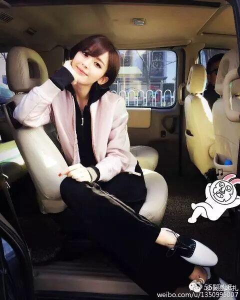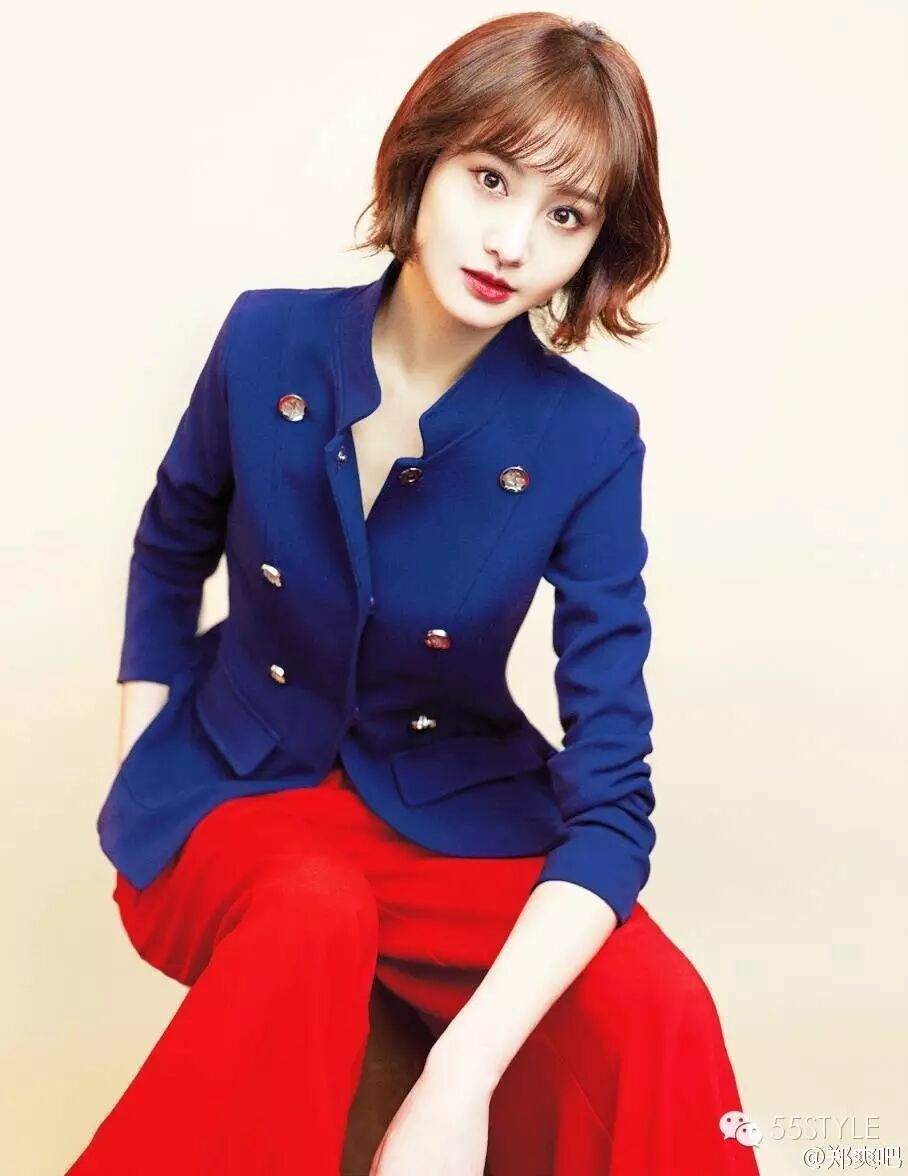 爽妹子身穿蓝色修身上衣搭配红色超长款阔腿裤,简直潮得不行。不过让人眼前一亮的是,她的新发型,从正面看过去,短到脖颈、空气刘海,十分清新可人。