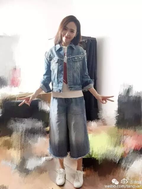 糖糖在微博晒出牛仔套装,牛仔外套搭配桃心少女卫衣+牛仔阔腿七分裤,小白鞋真是超美啊!