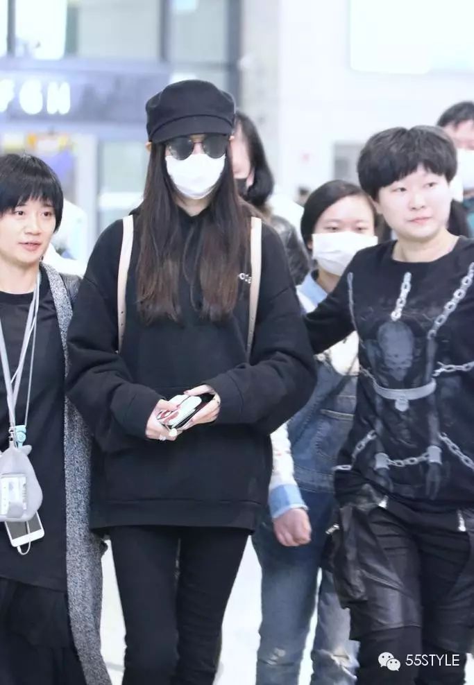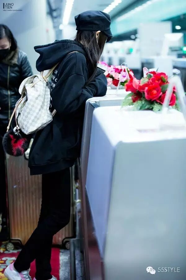比起私服照,糖糖的机场照就裹得十分严实,一袭黑衣,不过,小编 发现糖糖最爱的LV双肩背在身后,上面还绑着Fendi的“小老头”,大写的可爱。