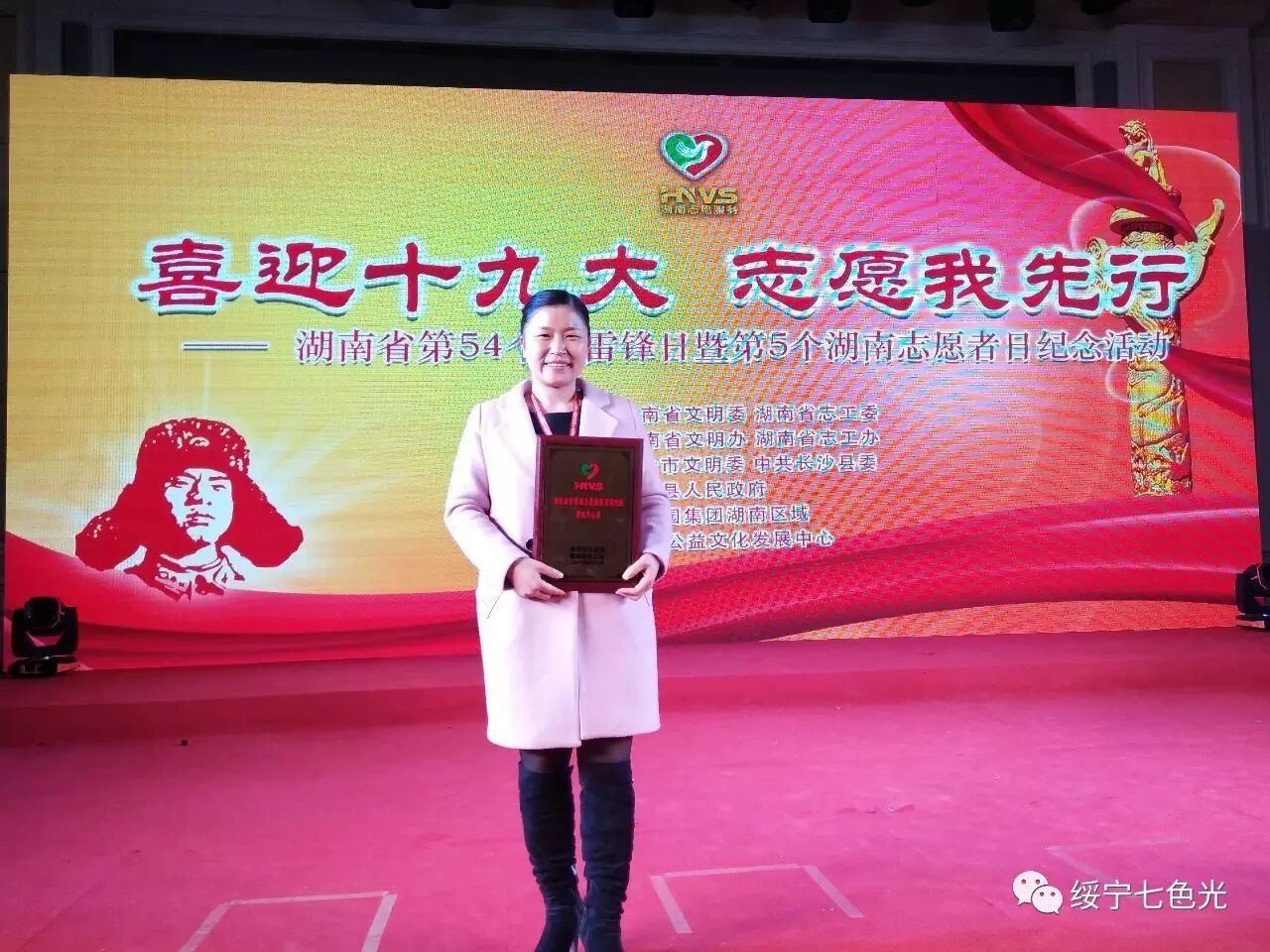 绥宁七色光青少年志愿服务队队长肖玉梅领奖