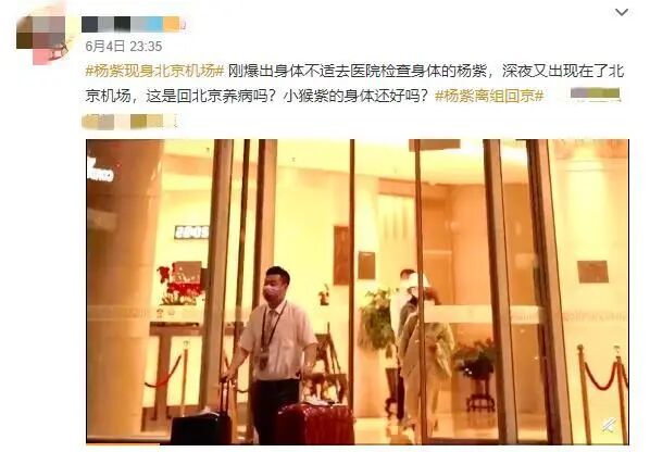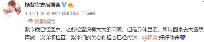 杨紫官方后援会给出的说法是"之前的检查没有太大的问题,身体重要所以回京去大医院再做一次详细的检查"。