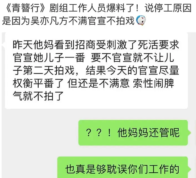 又有所谓的工作人员传出,说其实是吴亦凡妈妈看到招商受刺激,死活要求官宣她儿子一番,剧组权衡平番,吴亦凡这边还是不满意,就闹罢工。