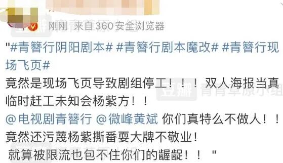 之后,杨紫粉丝还爆出《青簪行》剧组作妖,使用阴阳剧本,并对原著魔改,现场飞页,却污蔑杨紫撕番耍大牌不敬业。