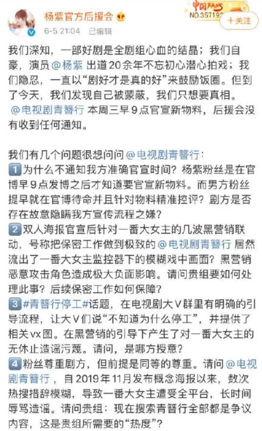 杨紫后援会更是发博提出四问并艾特青簪行官博,