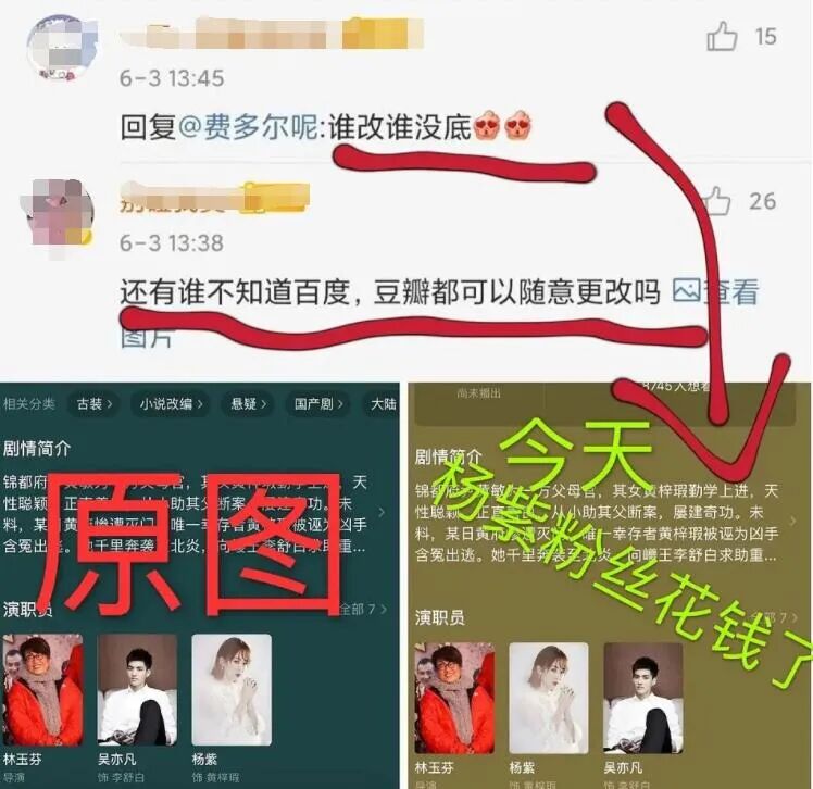 此外,网友发现,杨紫粉丝这边还跑去改了豆瓣电影上《青簪行》的演员简介,把杨紫的影人页放在吴亦凡的影人页前面。