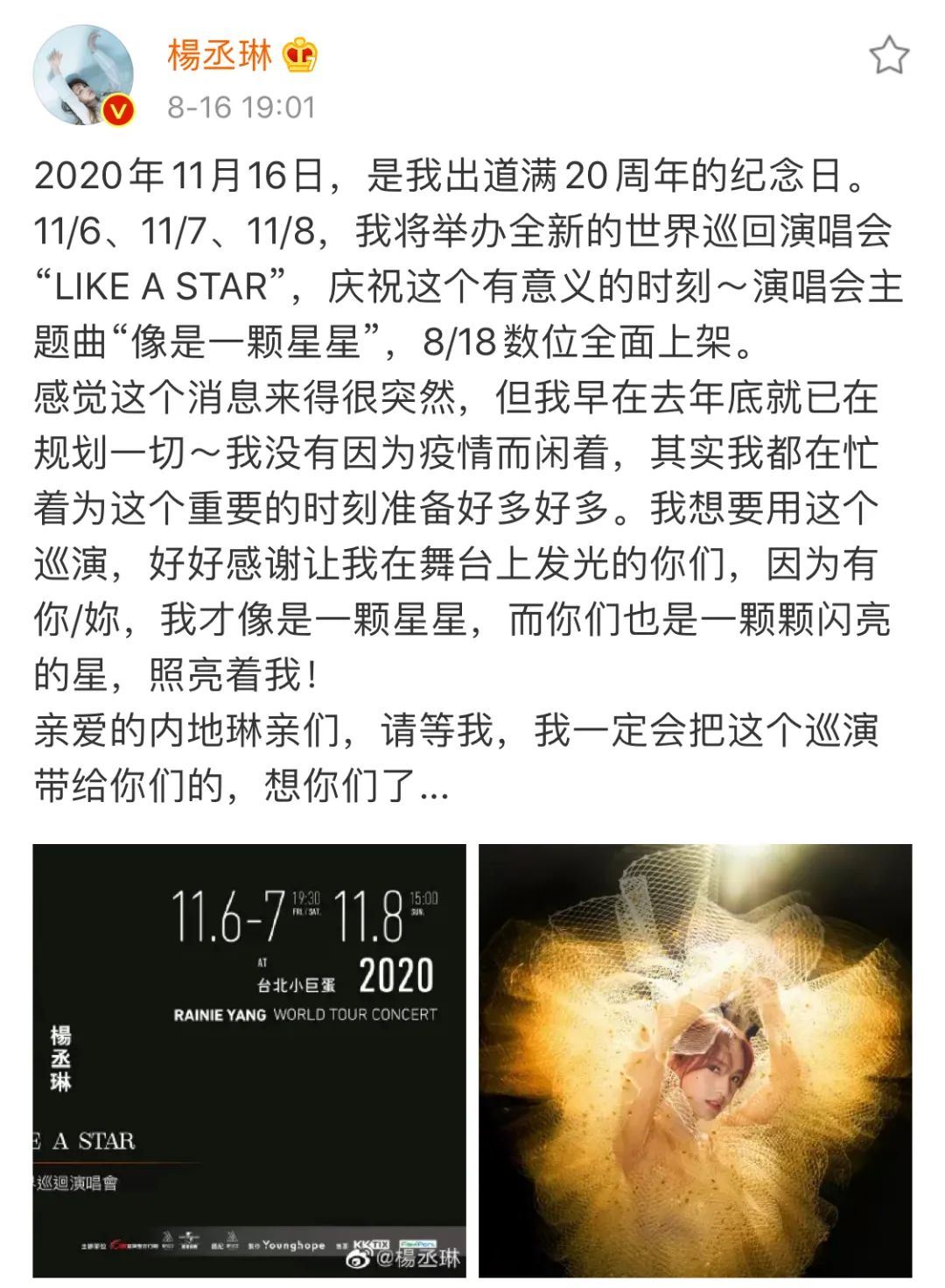 杨丞琳的歌迷们,请收下这颗特制甜糖! QQ音乐 港台女星 2020-08-18 12:24:38 1061 创作不易,用心坚持,欢迎请BaGua喝几杯爱心咖啡!打赏并支持本文 打赏并删除本文 今日凌晨,杨丞琳的最新单曲《像是一颗星星》在QQ音乐正式上线。这是她送给歌迷的出道20周年的纪念献礼,也是2020全新世界巡回演唱会“LIKE A STAR”的主题曲。同时,这首歌也是杨丞琳和她先生李荣浩再次合作的作品。《像是一颗星星》由李荣浩填词并担任制作人,将杨丞琳出道20年来的心路历程,融入直白通透的歌词当中。杨丞琳提到,当初一收到歌词就感觉非常触动,但她只知道李荣浩用了非常短的时间就写好了歌词。至于为什么会有这样的创作灵感?李荣浩说:“我觉得当今的娱乐圈发展到现在,有20年经历的艺人也有很多,我发现他/她们都有一个共同点,就是前20年一直希望自己更亮更光,一旦过了一个时间,他们会追求的东西越来越专注在自己的专业,而在这个时候他们可能自己也不自知,就是他们即使不发光,也已经是一颗星星了,即使私下很轻便,但也是自带了星星的魅力。”的确,杨丞琳的发展,像极了李荣浩说的这个样子。2000年她随组合「4 in love」正式出道;在偶像剧《流行花园》的女配“小优”一角让更多人熟知;组合解散后,相继出演《恶魔在身边》《不良笑花》《海派甜心》等人气偶像剧;推出《暧昧》《带我走》《雨爱》等传唱度非常高、至今还是不少人去KTV必会选择的歌曲。出过不少大热的作品,一直走着发光发亮的路。但到了现在的阶段,杨丞琳想往更加专业的方向发展。她近年发布的专辑《年轮说》《删·拾 以后》,乐评口碑都不错。而且从《删·拾 以后》开始,她尝试自己全权负责专辑的制作统筹、企划、MV导演等工作,挑战许多“第一次”。这20年里,大众见证着杨丞琳从青涩到成熟的成长蜕变,身份也早从可爱教主转变成了能够独当一面的全能艺人。李荣浩在《像是一颗星星》中写到:“最大的成就,是一些人会替我记得,我做过什么。” 想必,这就是杨丞琳对粉丝的心声吧(小编听后感:有 被 你 们 夫 妻 甜 到 !) 推荐阅读 创作不易,用心坚持,欢迎请BaGua喝几杯爱心咖啡!打赏并支持本文 打赏并删除本文 感谢您的支持鼓励,我会继续努力的!文章地址:用户邮箱:打赏金额:USDT 请输入数字点击”去打赏“,即可进行打赏支持本文章哦 杨丞琳 About the Author QQ音乐 功能介绍:可能是地球上最好的音乐公众号 官方认证:深圳市腾讯计算机系统有限公司 Related Posts 我 天 ,I U 和 李 钟 硕 真 的 谈 恋 爱 了 ! 2023-01-01 13:51:47 29岁的段宜恩,又要继续“披荆斩棘”了 2022-09-04 19:03:32 周笔畅、姚琛齐打call,你永远可以相信YOUNG MUSIC们的舞台! 2022-08-24 18:57:14 李荣浩:今天37岁了,我的人生很满足 2022-07-11 19:01:02 惊喜来临 | 林宥嘉XIANGYUYIYANG线上演唱会来了! 2022-01-21 19:41:50 发表评论
