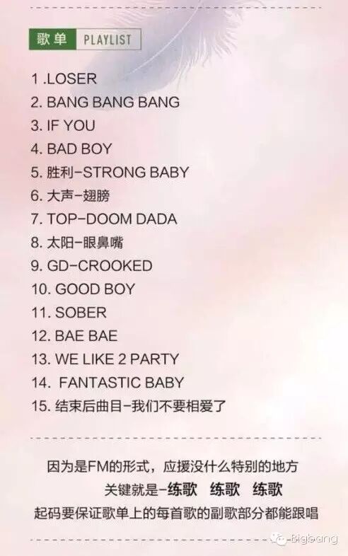 BigBang2016三巡北京FM见面会时间+歌单+门票+购票地址 日韩男星 2016-04-22 22:01:51 1046 创作不易,用心坚持,欢迎请BaGua喝几杯爱心咖啡!打赏并支持本文 打赏并删除本文 BigBang三巡北京FM时间:7月16、7月17在乐视体育文化中心举办两场,北京文化局批文如下:BigBang三巡北京FM歌单统一说明,批文上的歌单只是把所有可以唱的歌曲都报批了,实际上还是14首,和一轮城市一样。BigBang三巡北京FM门票+购票方式基本上和二巡也一样。BIGBANG微信公众号:BIGBANG_FAMILY长按二维码关注:BIGBANG 创作不易,用心坚持,欢迎请BaGua喝几杯爱心咖啡!打赏并支持本文 打赏并删除本文 感谢您的支持鼓励,我会继续努力的!文章地址:用户邮箱:打赏金额:USDT 请输入数字点击”去打赏“,即可进行打赏支持本文章哦 bigbang 发表评论