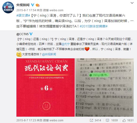 至于宁泽涛该怎么读...... 央视微博曾经对此进行过科普。