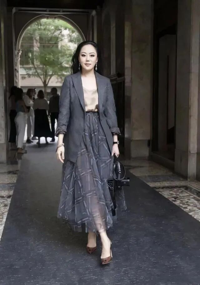 章小蕙穿的仙女裙采用双层设计,里面的灰色格子搭配浅灰色薄纱,低调、时尚、高级。尤其是在选材上,还采用了透视面料,若隐若现,更显修长美腿,营造出朦胧浪漫的美感。