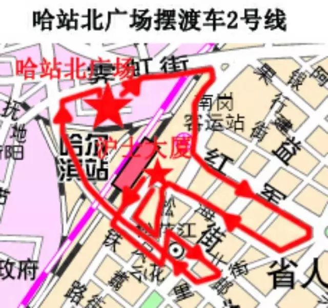 摆渡车2号线:由哈尔滨站北广场发车至沪士大厦,返回由沪士大厦发车至哈尔滨站北广场候车室门前。