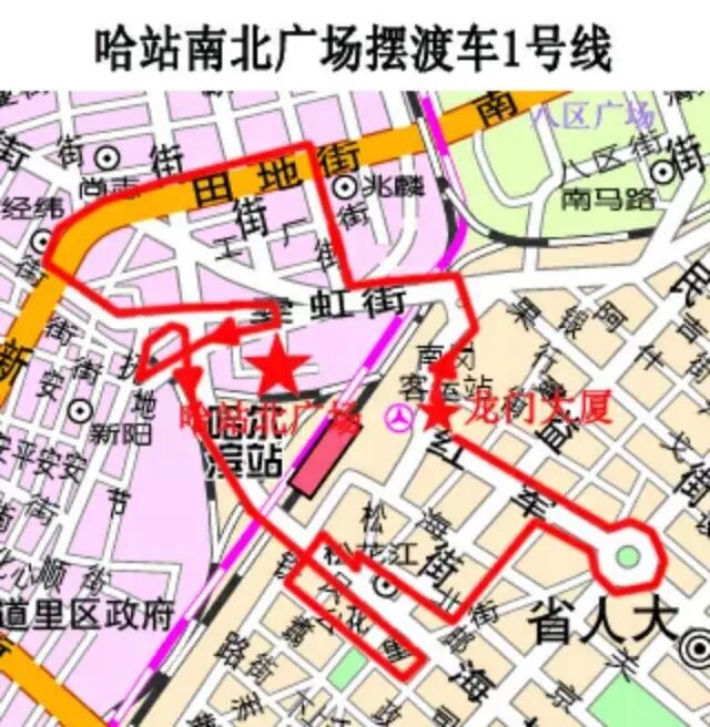 摆渡车1号线:由龙门大厦发车,至哈尔滨站北广场(停车位置在哈尔滨站北广场候车室对面),返回由哈尔滨站北广场至龙门大厦。