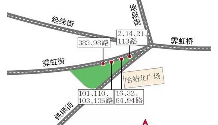 哈尔滨站北广场的公交站点现有港湾式的4个分站点。据了解,港湾式站台将固定相当长一段时间,直到地铁二号线在该路段的施工结束,部分公交线会再次调整。
