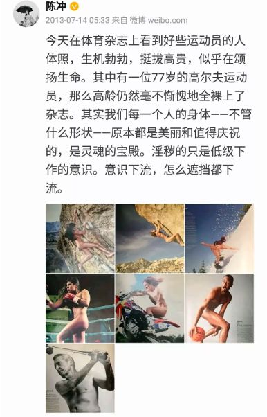 陈冲在微博上经常表达自己对各种身体之美的欣赏