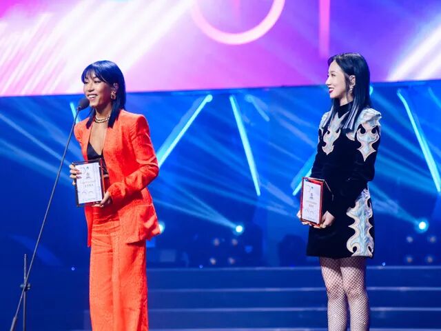 一身亮橘气场2米的吉克隽逸与白皮孟美岐同台,各自美丽,只能比比牙白。