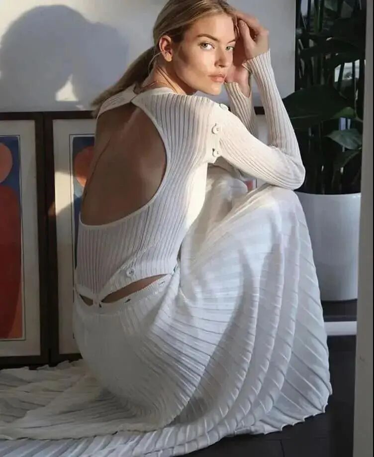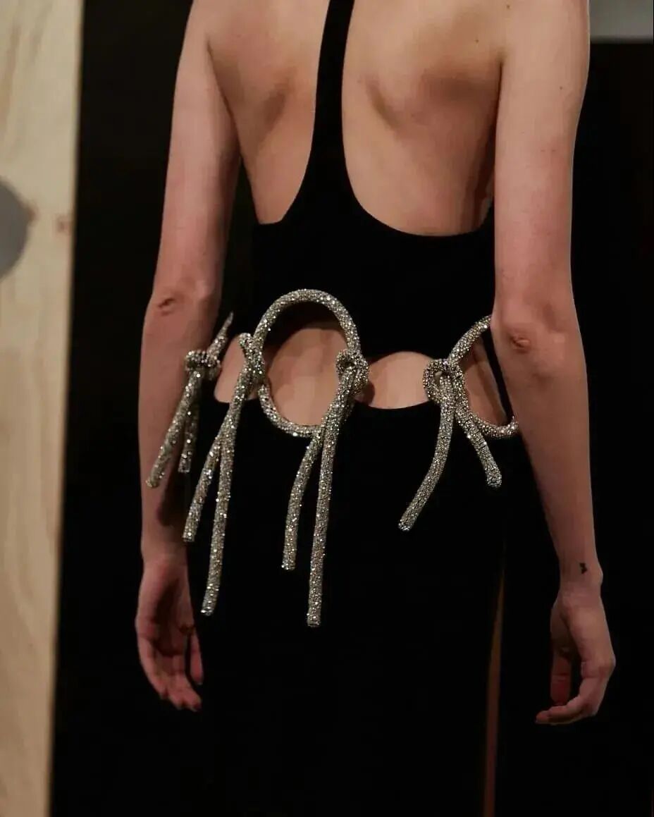 后背挖空的连衣裙设计既能展示身材曲线,又不像低胸装那么妖娆,高级感十足。